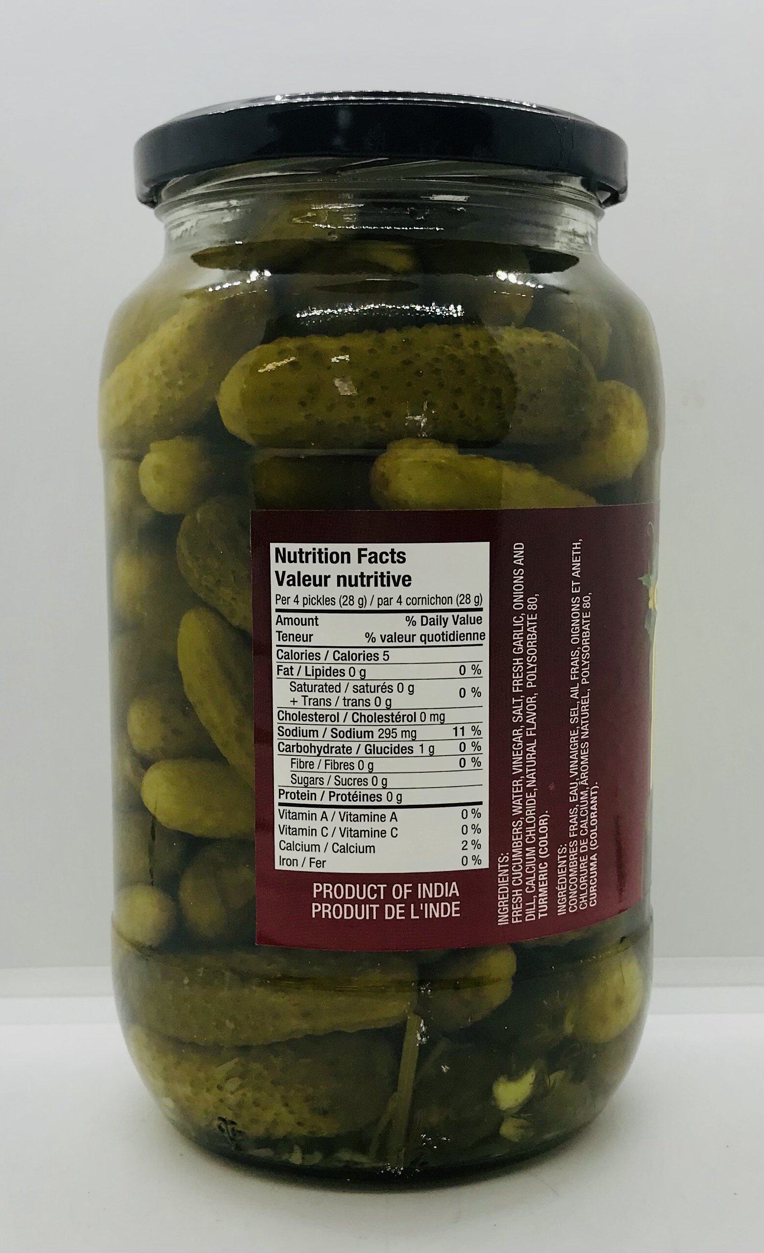 Fresh cucumbers, water, vinegar, salt, fresh garlic, onions and dill, calcium chloride, natural flavor, polysorbate 80, turmeric.