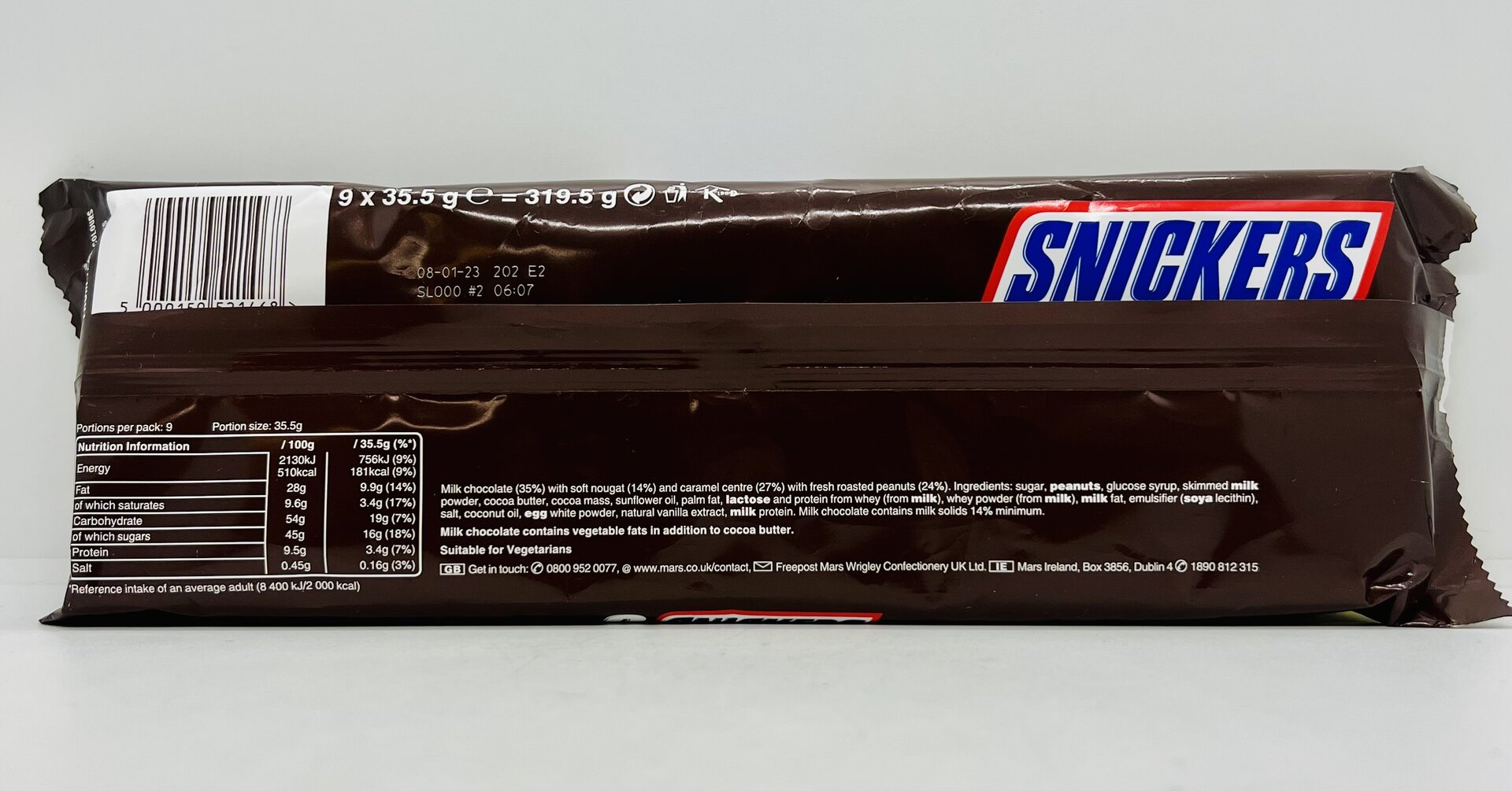 Milk chocolate (35%), with soft nougat (14%) and caramel centre (27%) with fresh roasted peanuts (24%). Ingredients: sugar, glucose syrup, peanuts, cocoa butter, skimmed milk powder, cocoa mass, lactose, sunflower oil, milk fat, whey powder (from milk), palm fat, salt, emulsifier (soya lecithin), egg white powder, milk protein, natural vanilla extract.