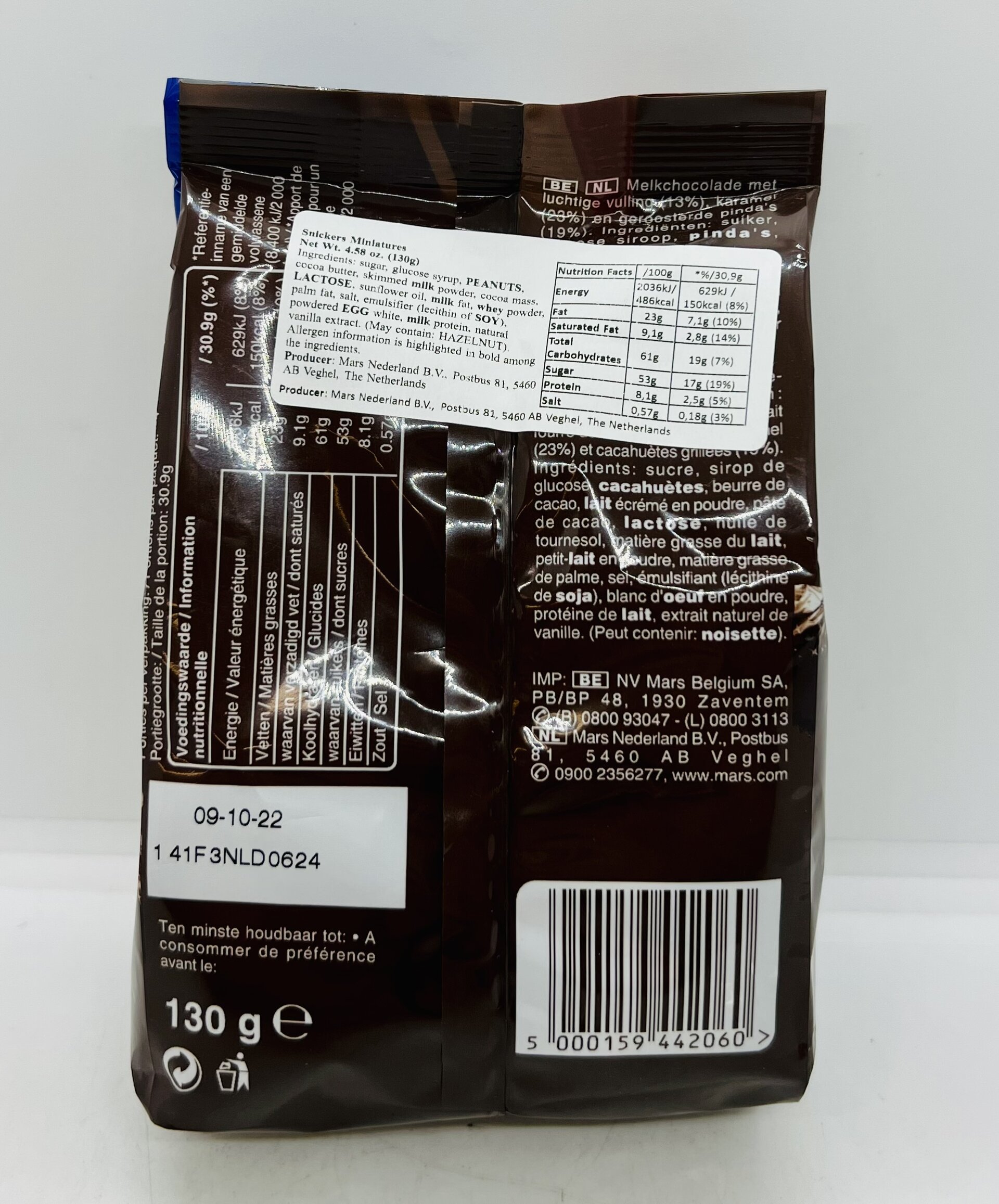 Milk chocolate with soft nougat (13%) and caramel centre (23%) with fresh roasted peanuts (19%). Ingredients: sugar, glucose syrup, peanuts, cocoa butter, skimmed milk powder, cocoa mass, lactose, sunflower oil, milk fat, whey powder (from milk), palm fat, salt, emulsifier (soya lecithin), egg white powder, milk protein, natural vanilla extract.