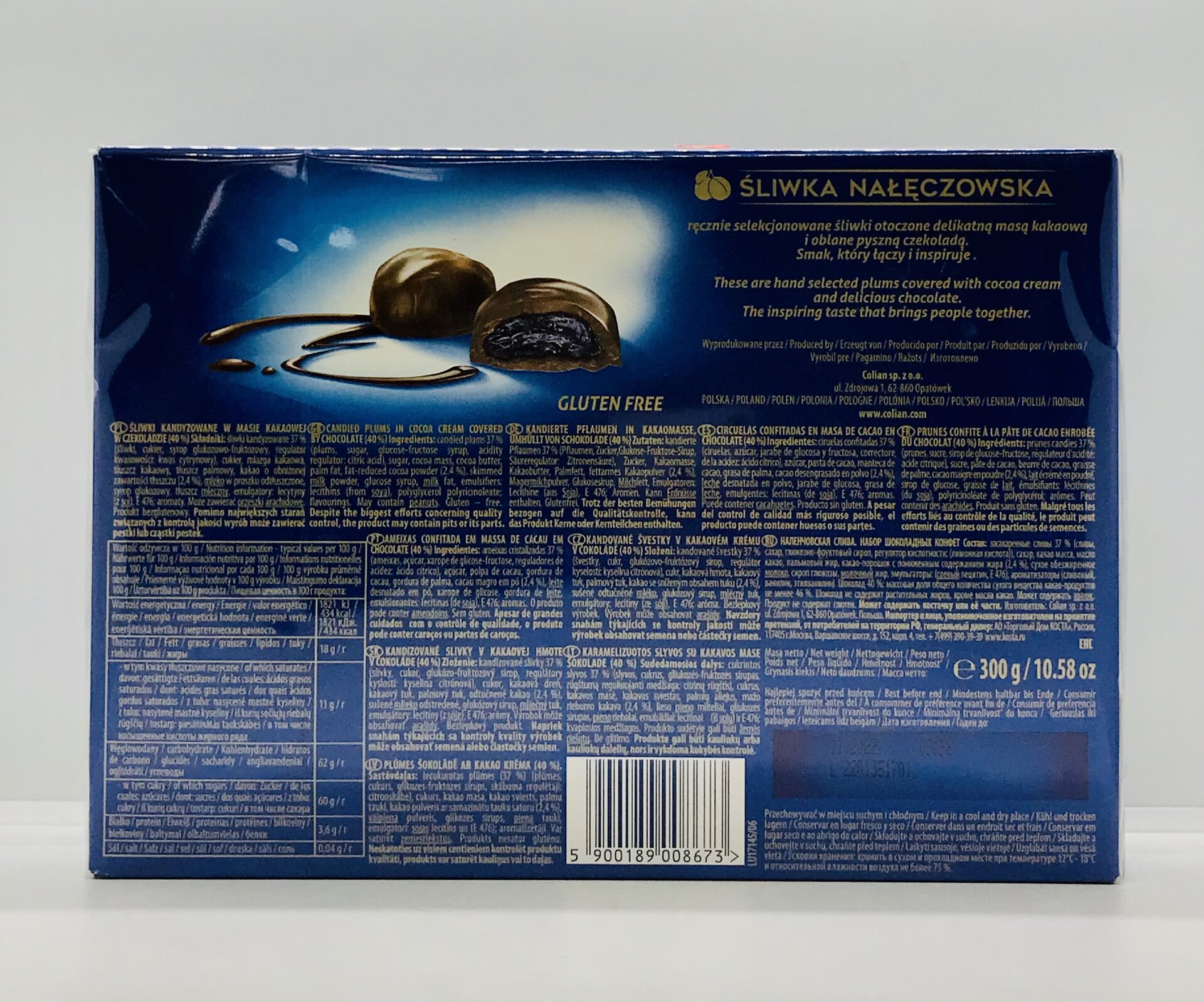 Candied plums 37% (plums, sugar, glucose-fructose syrup, acidity regulator: citric acid), sugar, cocoa mass, cocoa butter, palm fat, fat-reduced cocoa powder (2.4 %), skimmed milk powder, glucose syrup, milk fat, emulsifiers: lecithins (from soya), polyglycerol polyricinoleate; flavourings.