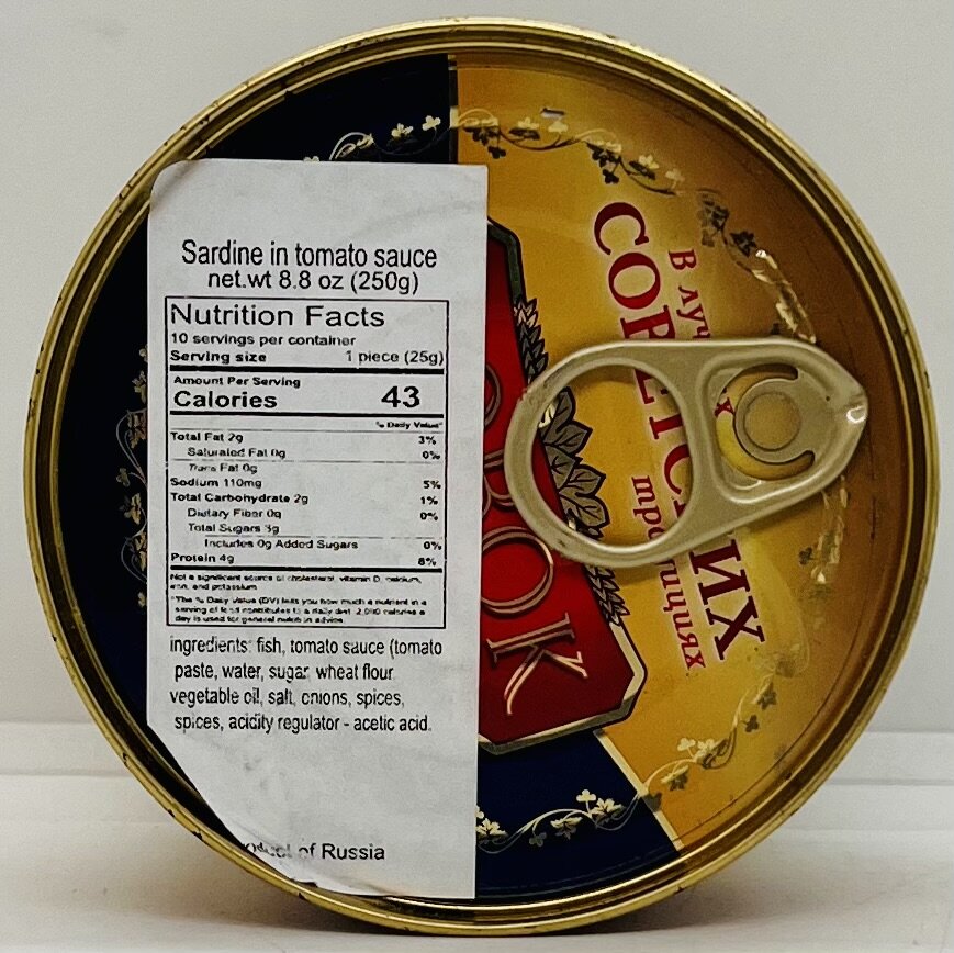 Fish, tomato sauce (tomato paste, water, sugar wheat flour. vegetable oil, salt, onions, spices. spices, acidity regulator-acetic acid.