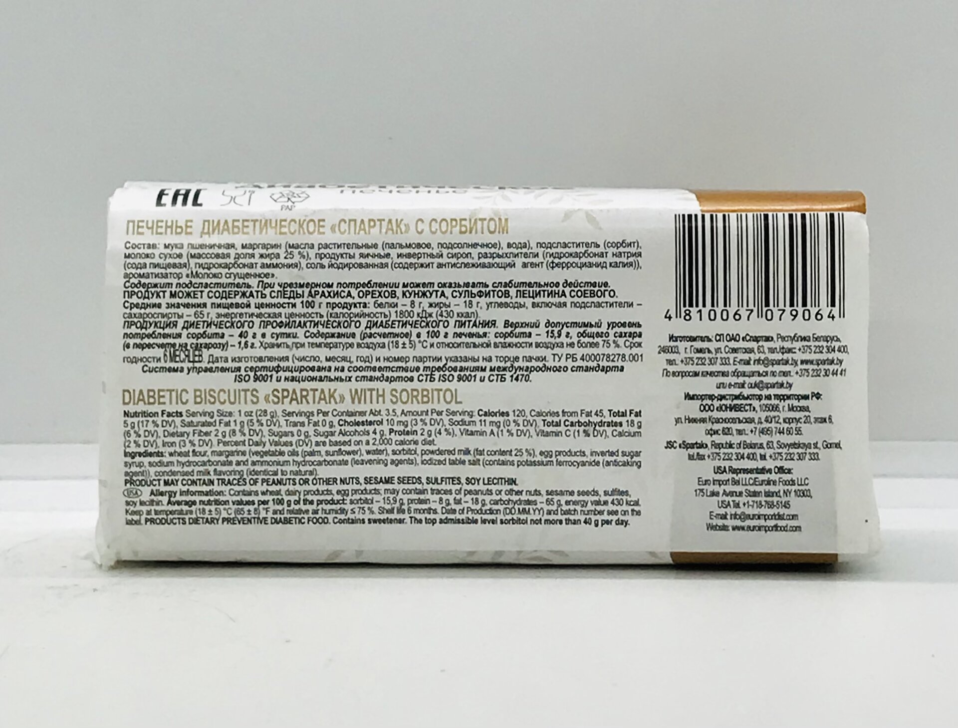 Wheat flour, margarine (vegetable oils (palm, sunflower), water), sorbitol, powdered milk (fat content 25 %), egg products, inverted sugar syrup, sodium hydrocarbonate and ammonium hydrocarbonate (leavening agents), iodized table salt (contains potassium ferrocyanide (anticaking agent)), condensed milk flavoring (identical to natural).