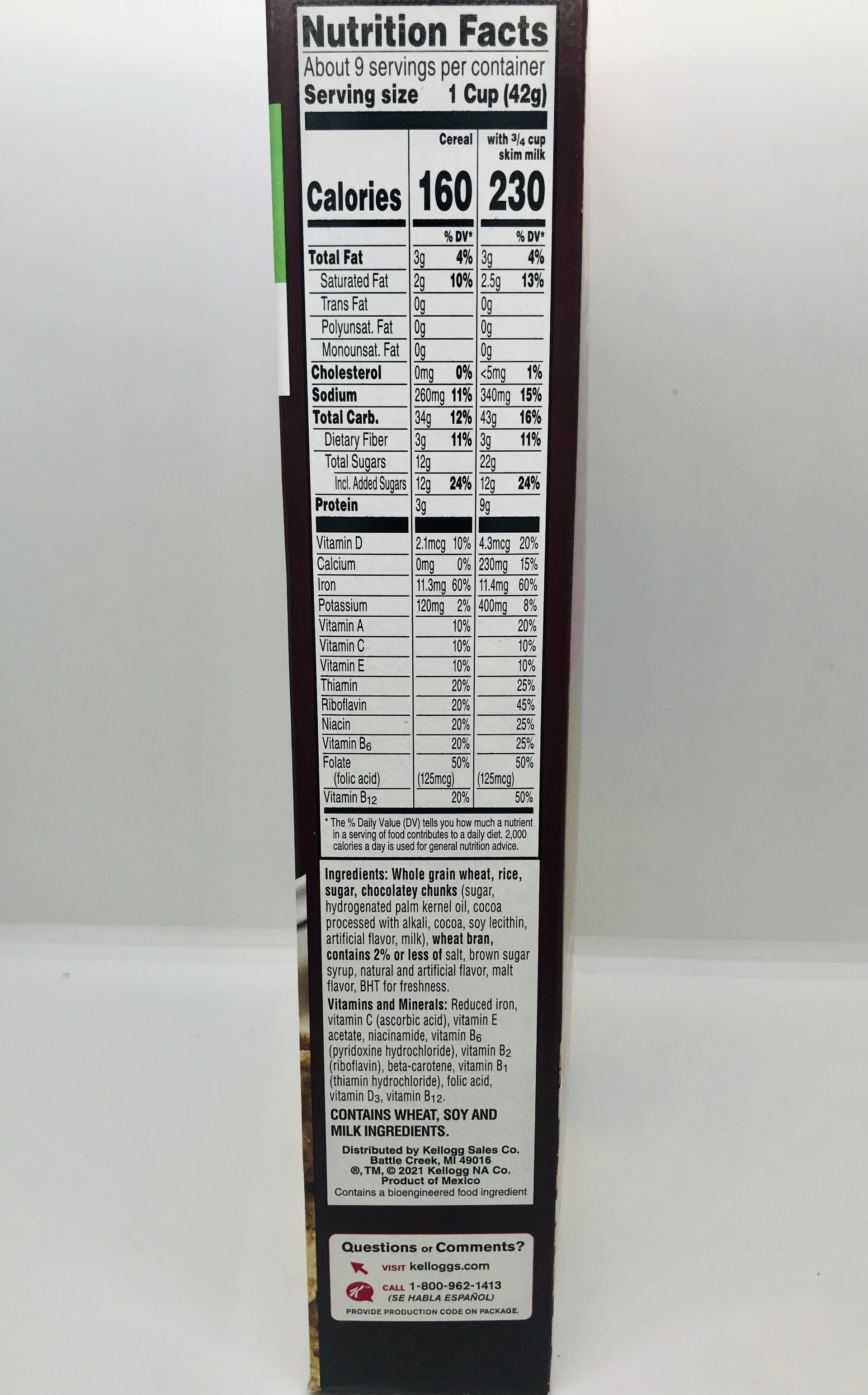 Whole grain wheat, rice, sugar, chocolatey chunks, wheat bran, Contains 2% or less of salt, brown sugar syrup, natural and artificial flavor, malt flavor, BHT for freshness.