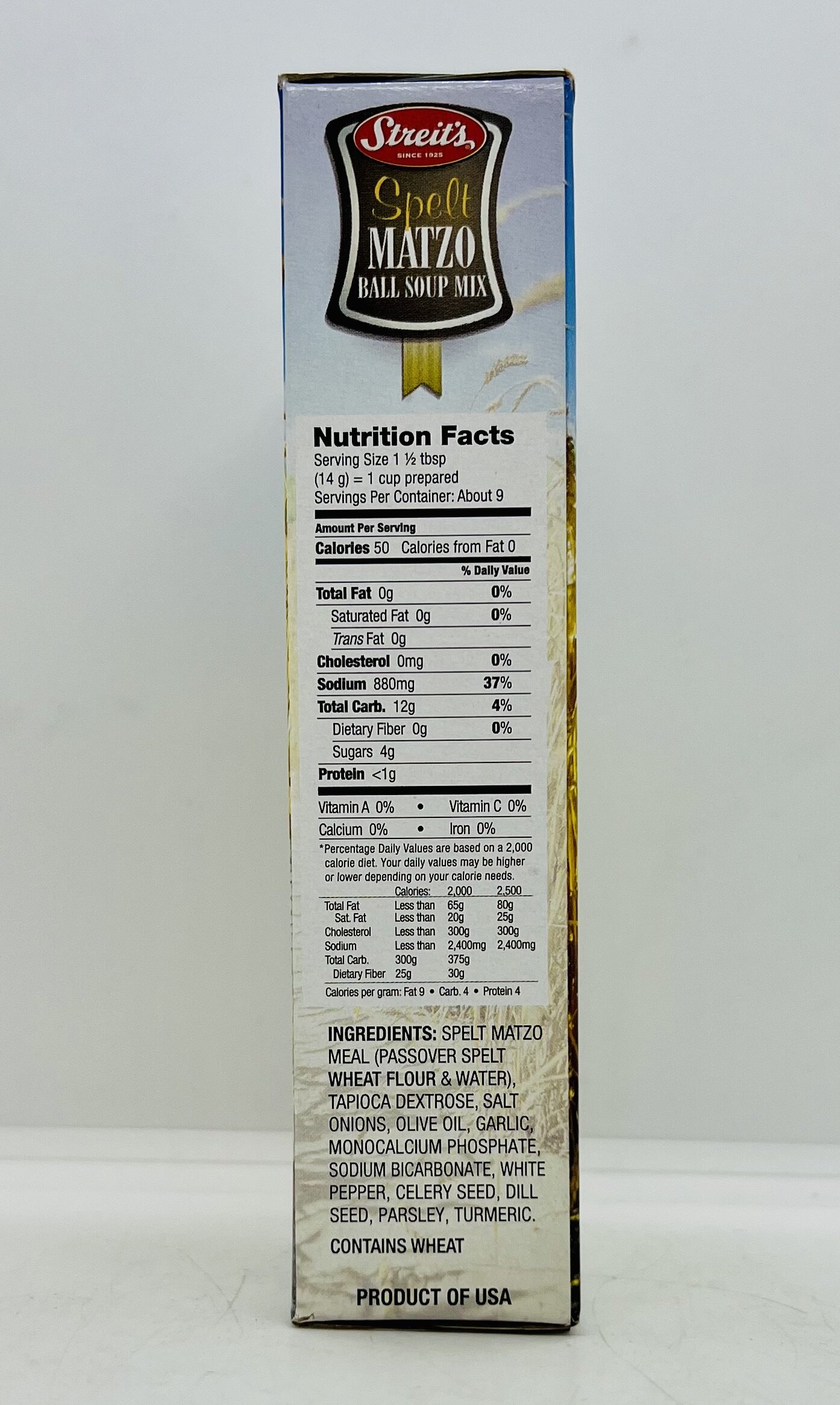 SPELT MATZO MEAL (PASSOVER SPELT WHEAT FLOUR & WATER), TAPIOCA DEXTROSE, SALT ONIONS, OLIVE OIL, GARLIC MONOCALCIUM PHOSPHATE, SODIUM BICARBONATE, WHITE PEPPER, CELERY SEED, DILL SEED, PARSLEY, TURMERIC.
