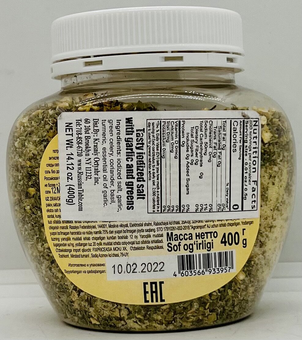 Iodized salt, garlic, green celery, coriander, basil, turmeric, essential oil of garlic.