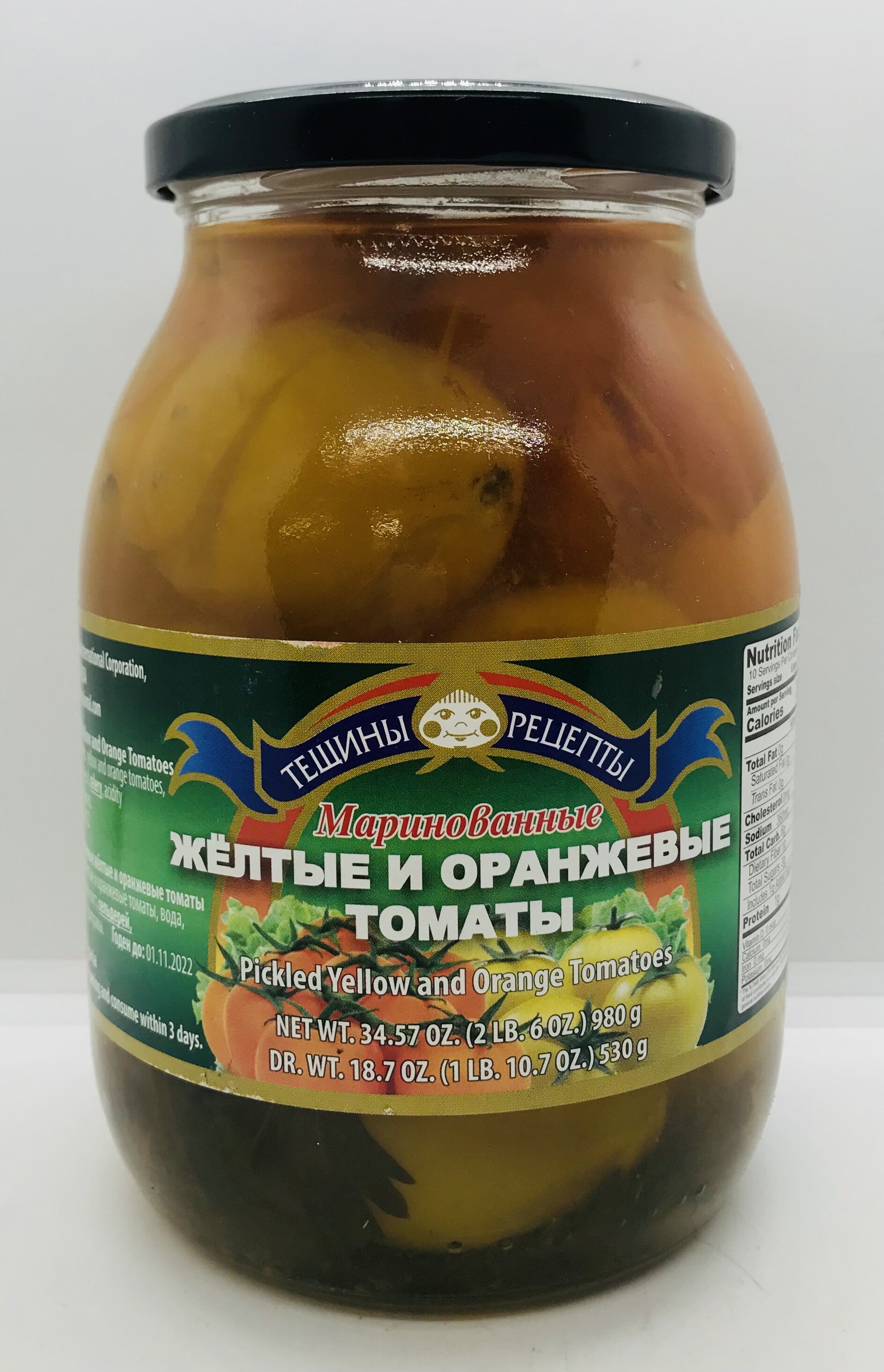 Yellow and orange tomatoes, water, sugar, salt, bay leaf, celery, acidity regulator, citric acid, spices.