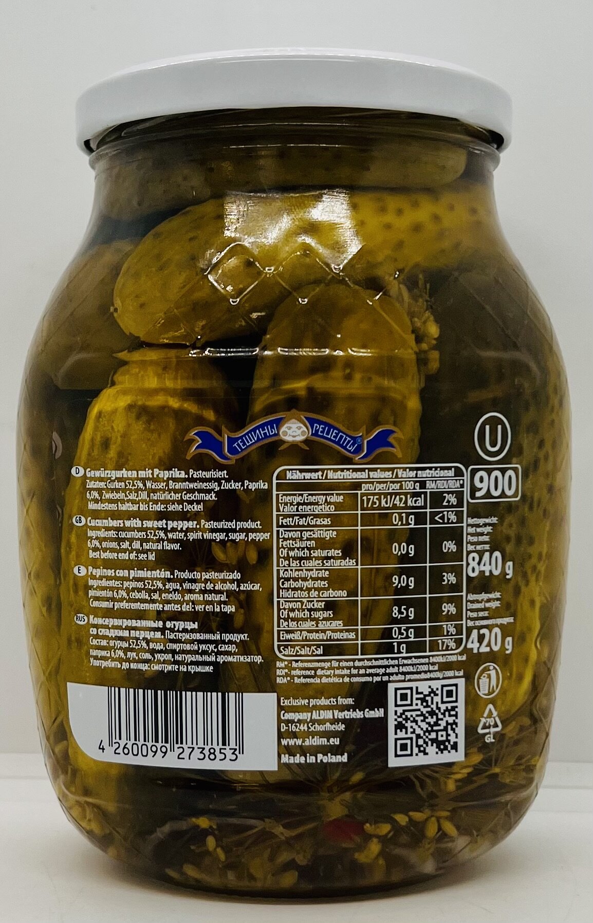 Cucumbers 52.5%, water, spirit vinegar, sugar, pepper 6%, onions, salt, dill, natural flavor.