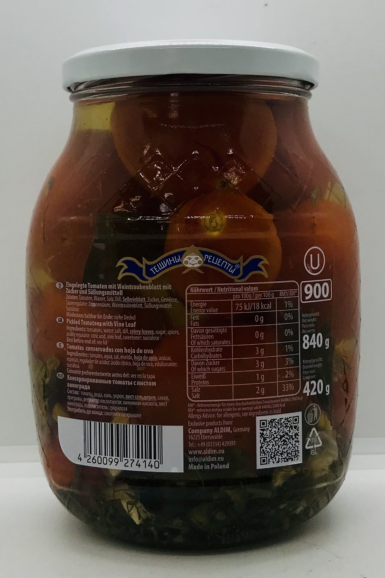 Tomatoes, water, dill, salt, celery leaves, sugar, spices, acidity regulator: citric acid, vine leaf, sweetener: sucralose.