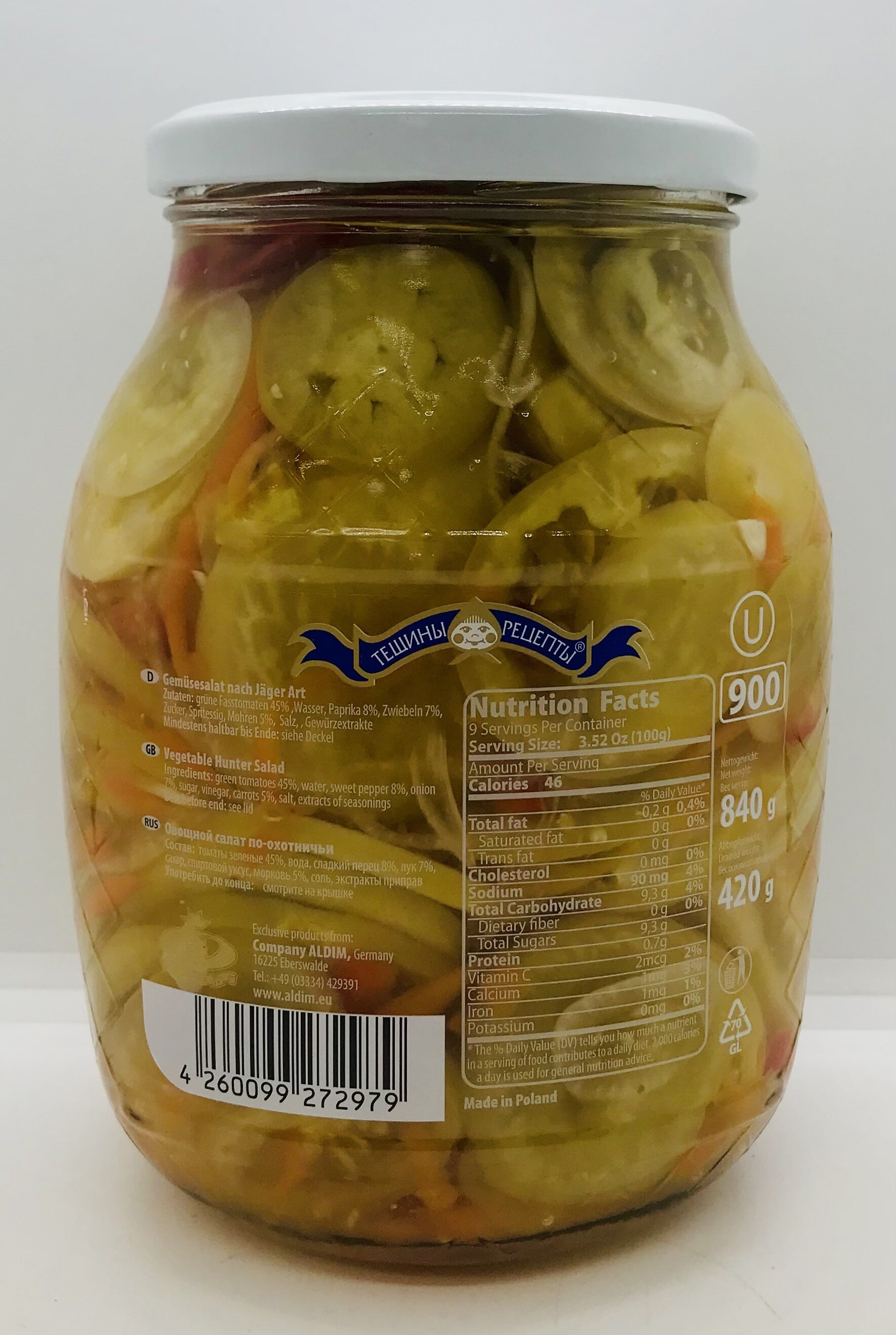 Green tomatoes 45%, water, sweet pepper 8%, onion 7%, sugar, vinegar, carrots 5%, salt, extracts seasonings.