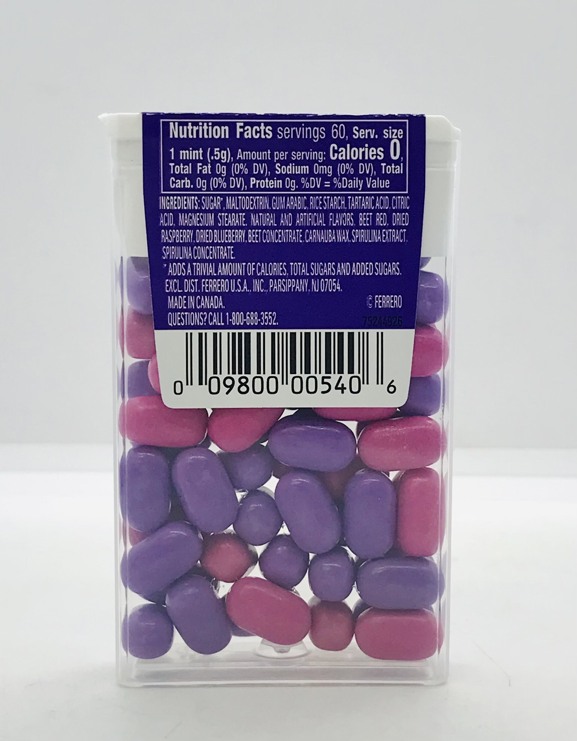 Sugar, maltodextrin, gum arabic, rice starch, tartaric acid, citric acid, magnesium stearate, natural and artificial flavors, beet red, dried raspberry, dried bluebery, be concentrate, carnauba wax, spirulina extract, spirulina concentrate. *adds a trivial amount of calories, total sugars and added sugars. excl. dist. ferrero u.s.a, inc., parsippany, nj 07054. made in canada. questions? call 1-800-688-3552. 75222711 6.