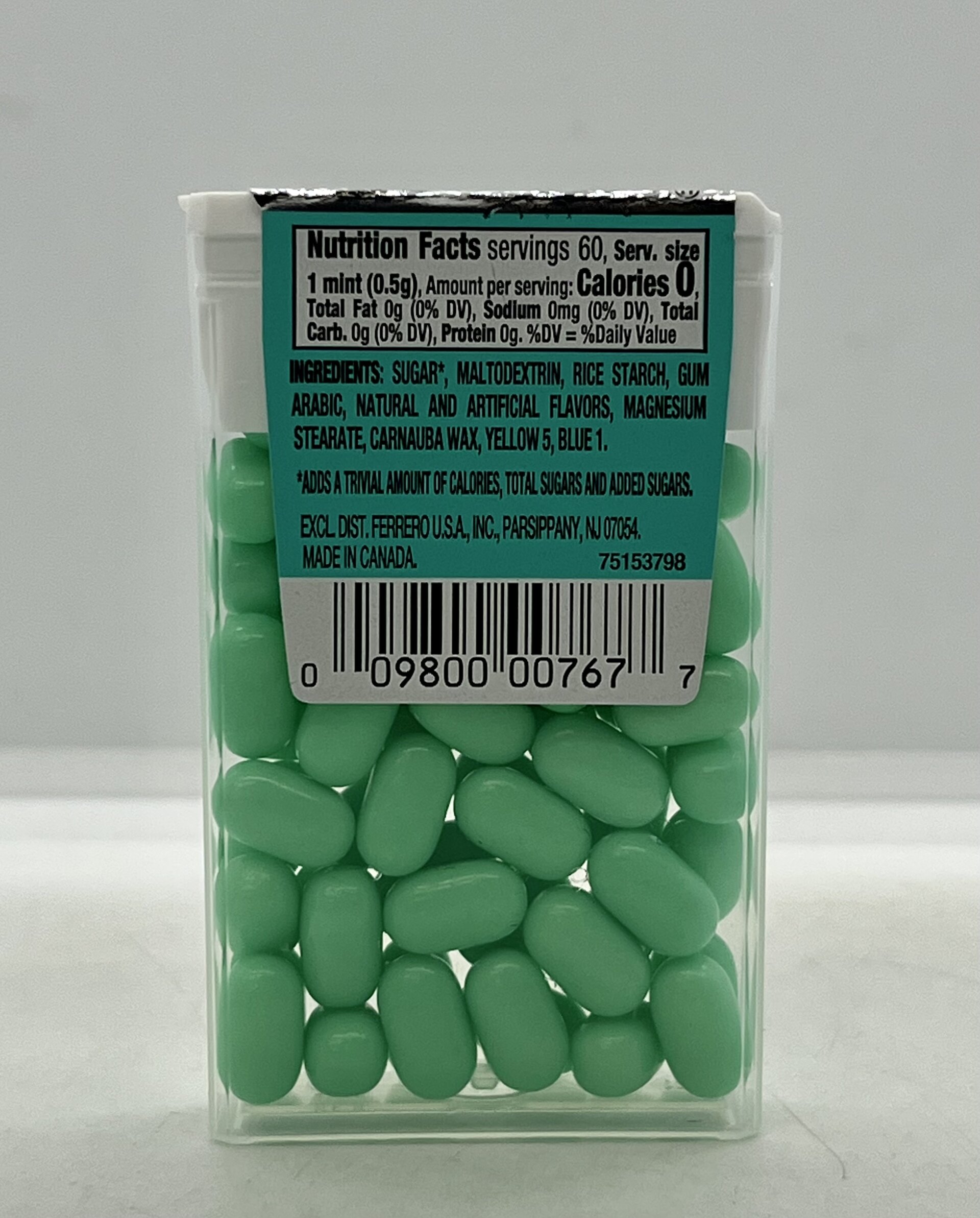 Sugar, maltodextrin, rice starch, gum arabic, natural and artificial flavors, magnesium stearate, carnauba wax, yellow 5, blue 1.