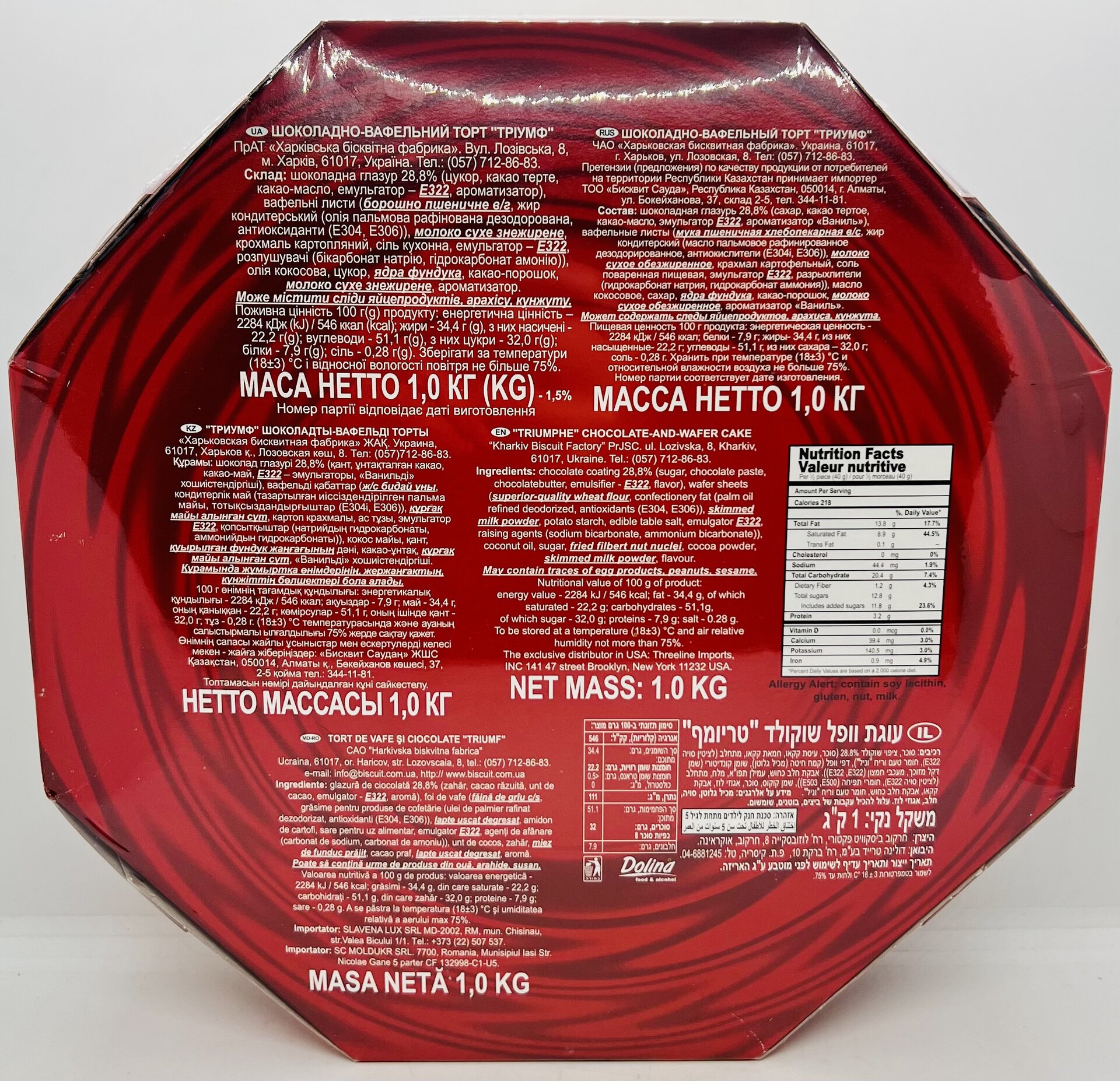 Chocolate coating 28,8% (sugar, chocolate paste, chocolate butter, emulsifier-E322, flavor), wafer sheets (superior-quality wheat flour, confectionery fat (palm oil refined deodorized, antioxidants (E304, E306)), skimmed milk powder, potato starch, edible table salt, emulator E322. raising agents (sodium bicarbonate, ammonium bicarbonate)). coconut oil, sugar, fried filbert nut nuclei, cocoa powder, skimmed milk powder, flavor.