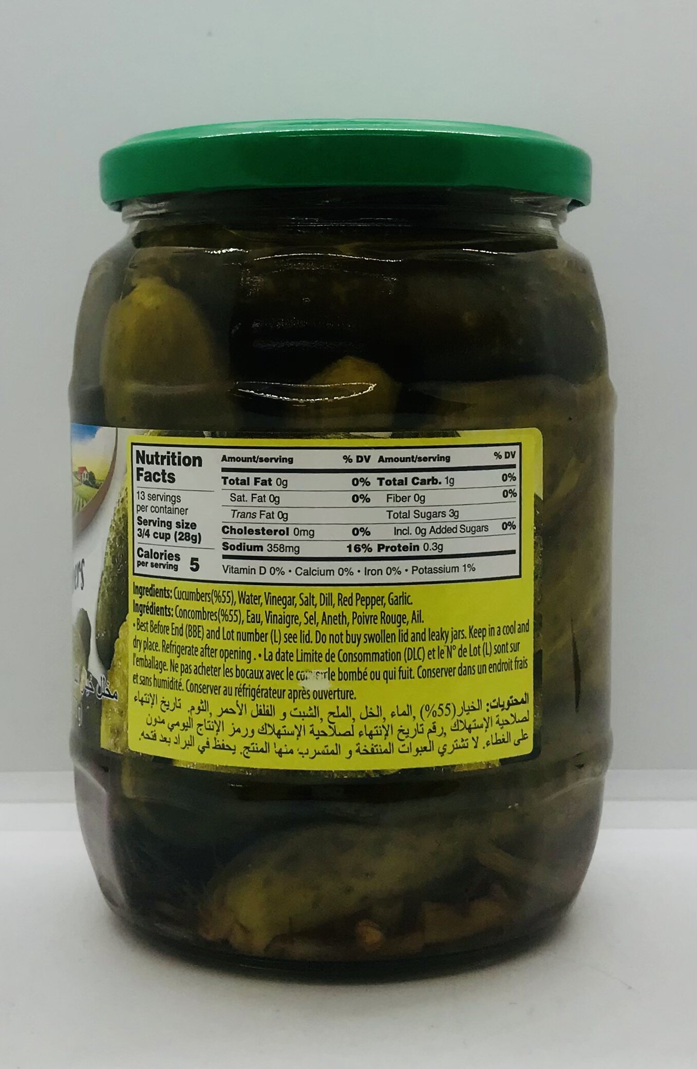 Cucumbers, water, vinegar, salt, dill, red pepper, garlic.