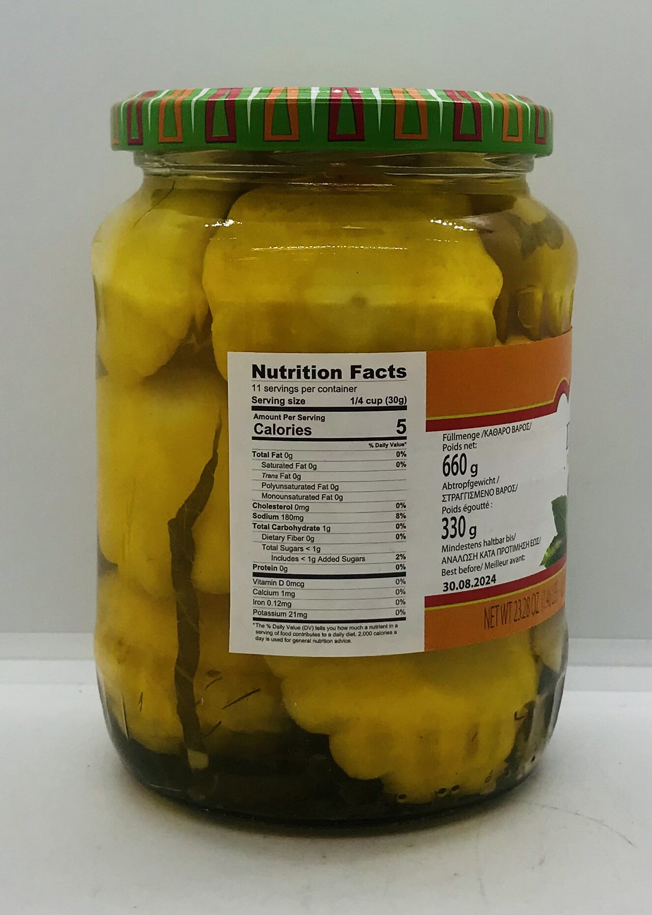 Pattypan squash, water, sugar, salt, dill, horse-radish, raspberry-leaf, bay-leaf, chili peppers, black pepper, citric acid, distilled vinegar.