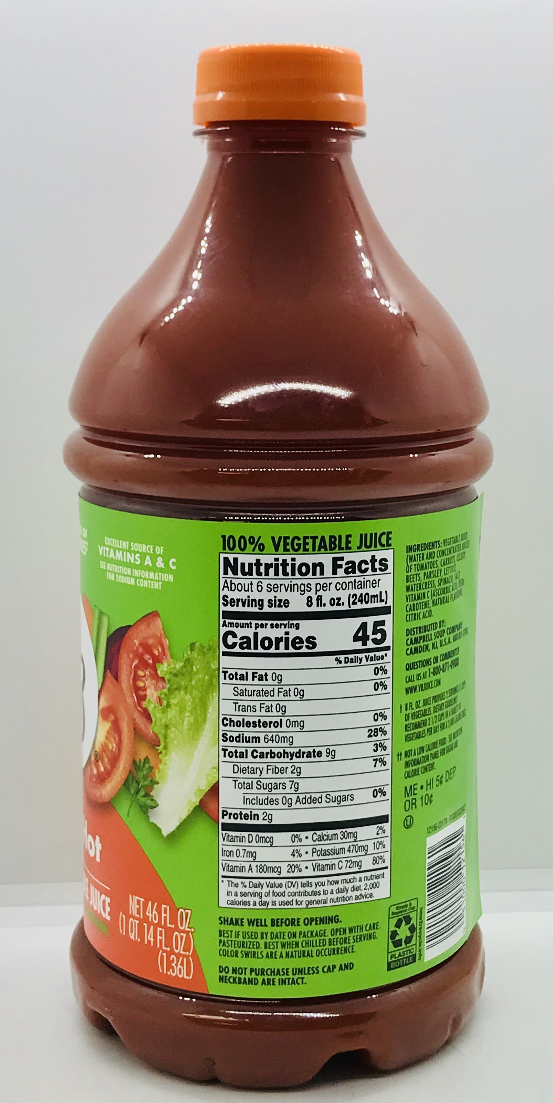 Vegetable juice(water and concentrated juices of tomatoes, carrots, celery, beets, parsley, lettuce, watercress, spinach), salt, vitamin C (ascorbic acid), beta carotene, natural flavoring, citric acid.