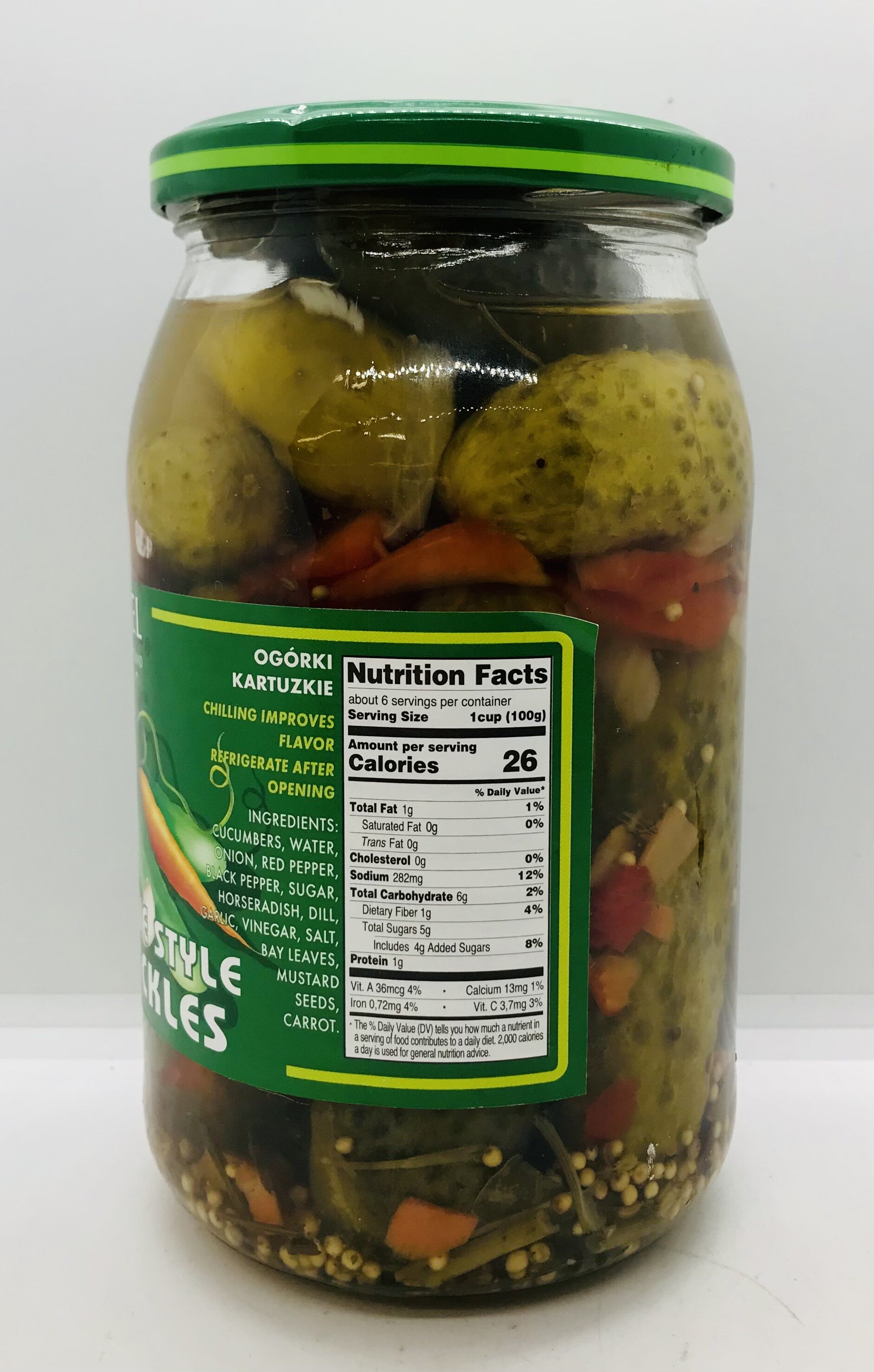 Cucumbers, water, onion, red pepper, black pepper, sugar, horseradish, dill, garlic, vinegar, salt, bay leaves, mustard seeds, carrot.