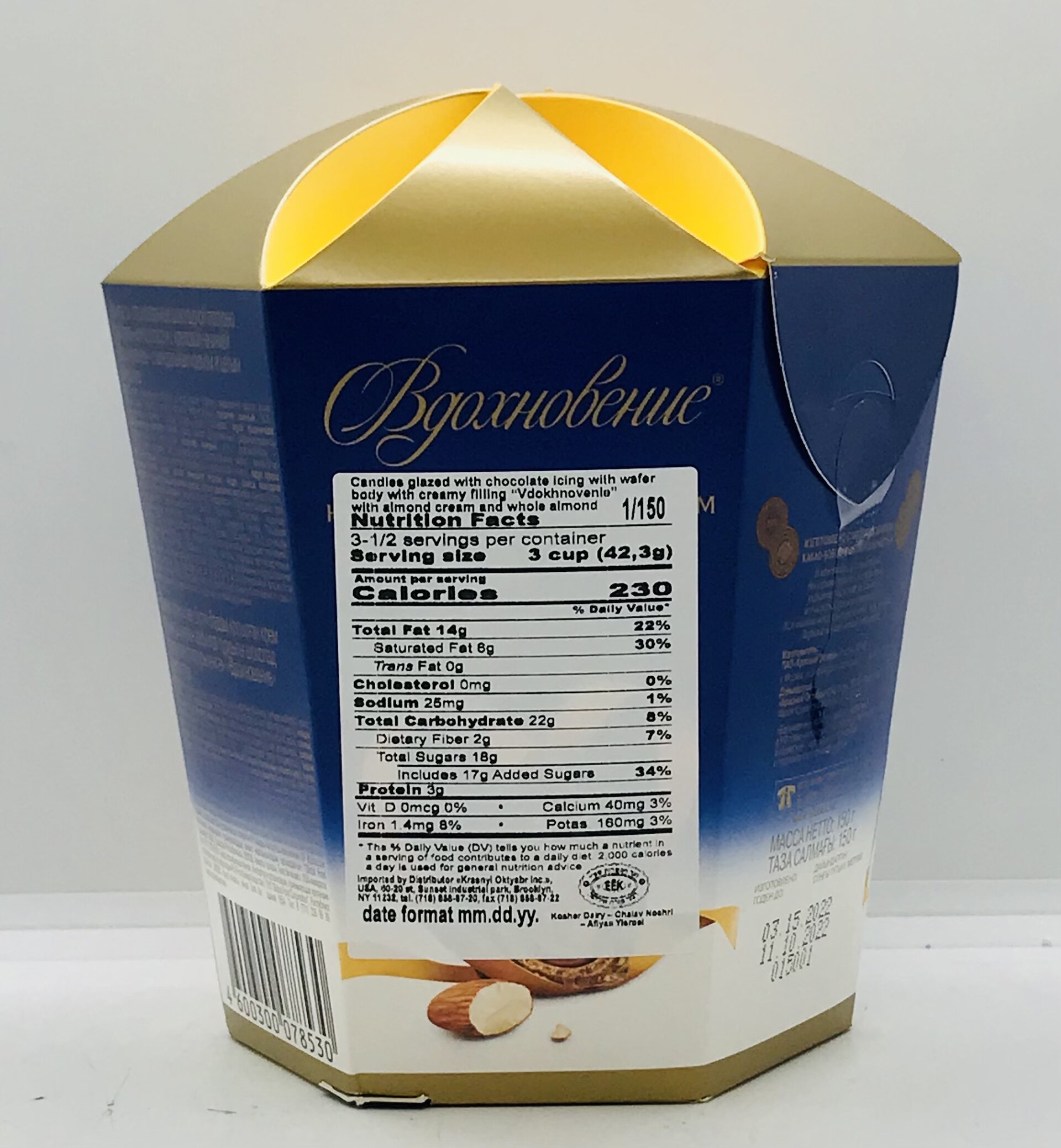 Chocolate Icing (53.5%) (sugar, cocoa mass, cocoa butter equivalent (refined, deodorized, fractionated, non-hydrogenated vegetable oils (palm oil, shea butter)), cocoa powder, emulsifiers soya lecithin E322 (less than 1% ) , ethers of polyglycerol and interetherified ricinoeic acids E476; flavouring "Vanilla"), sugar, wafers (7 6% ) (high grade wheat bread flour(96.5%), sugar, refined deodorized sunflower all (vegetable), emulsifier soya lecithin E322 (less than 1%), salt, leavening agent-sodium bicarbonate E500), confectionery fat (refined deodorized fractionated palm oil, emulsifier soya lecithin E322 (less than 1%). antioxidant mixed tocopherol concentrate E306), whole almond Karnal (5.7%), almond Karnal mass (5.0%), crushed almond Karnal (4.0%) whey powder(2.2%), whole milk powder (less than 1%), Cocos mass, emulsifier soya lecithin E322 (less than 1% ) flavouring Amaretto.
