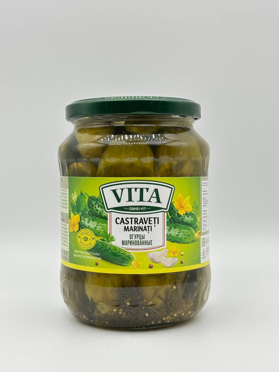 C ucumbers, water, herbs, garlic, spices, mustard seeds, sugar, salt, acidity regulator, acetic acid.