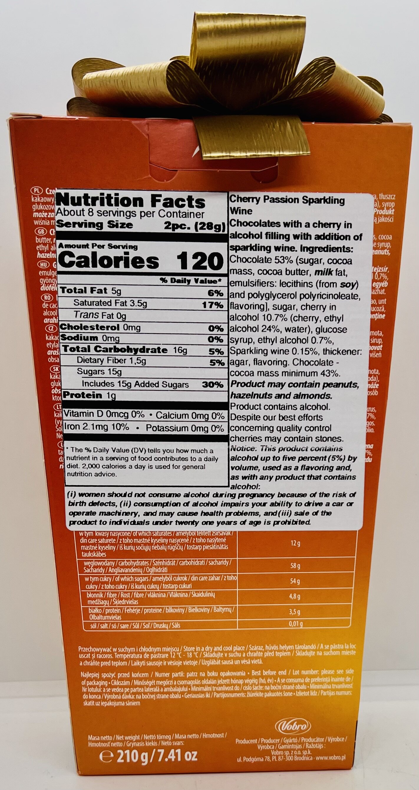 Chocolate 53% (sugar, cocoa teaser 10,79% emulsifiers: lecithin's (from soy) Egyed mass, cocoa butter, milk fat, and polyglycerol polyricinoleate, flavoring], sugar, cherry in alcohol 10.7% (cherry, ethyl alcohol 24%, water), glucose Azha.